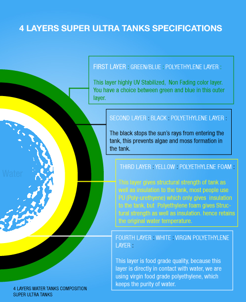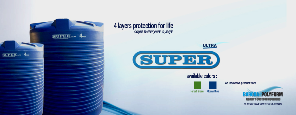 SUPER Water Tanks ( Four Layers Water Tanks) When it comes to manufacturing Water Tanks, SUPER from Baroda Polyform Pvt. Ltd. matches scales with international names. In order to deliver the best quality products, Baroda Polyform Pvt. Ltd. imports Hexene LLDPE resin with high density and low melt flow. This resin has high level of ESCR (Environmental Stress Crack Resistance). The SUPER Edge: